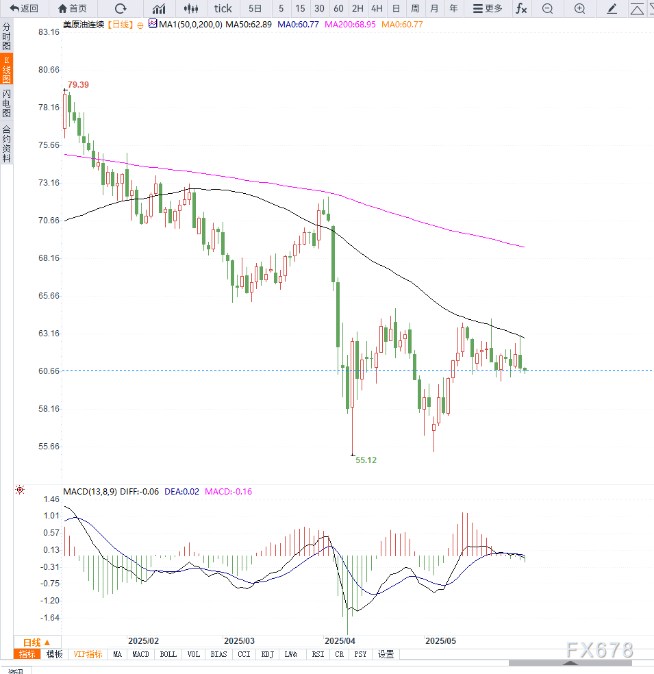 从技术分析角度看,美原油(WTI)日线图呈现出连续三日下跌的弱势形态,并已跌破60日均线,短期内MACD快慢线下穿,显示动能转弱。